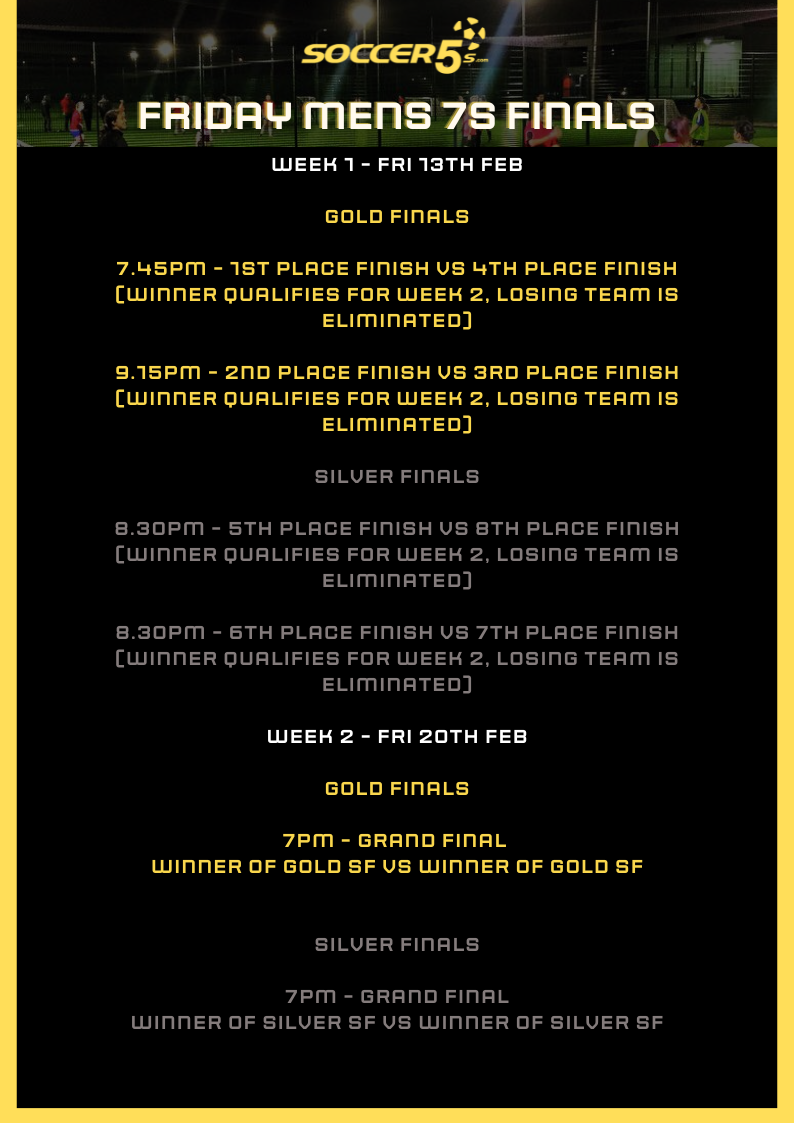 FINALS ARE HERE! Your position in finals will be decided on by your final position in the league. Finals begin Fri 13th Feb and below is an outline of how the finals for your competition will work. Please note the finals may change if any teams are unable to attend - if you are unable to attend the finals please text us on 0407614250 so we can adjust the draw to allow finals to run smoothly in advance.