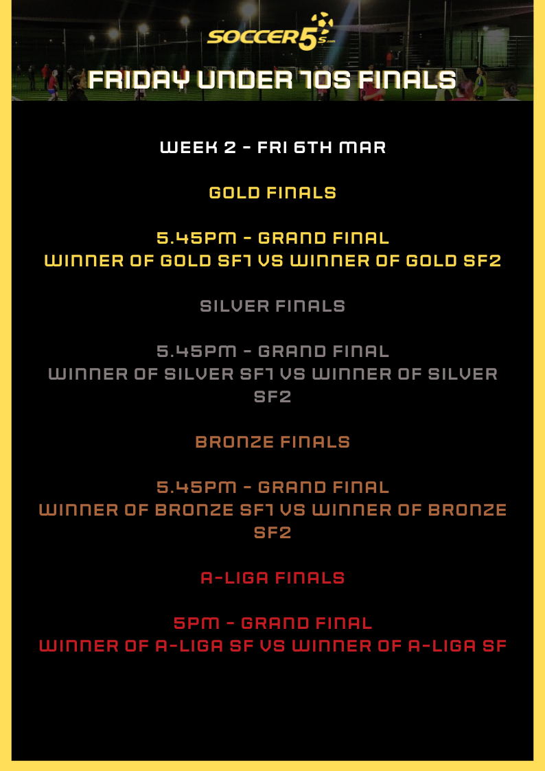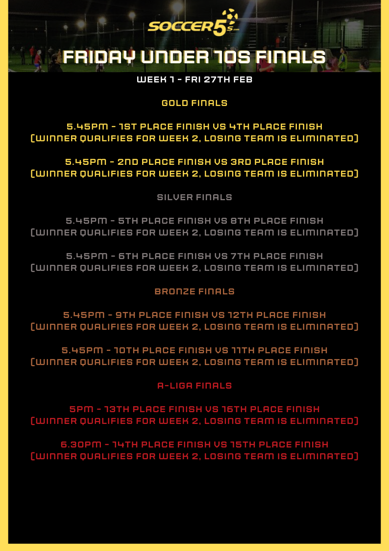 FINALS ARE HERE! Your position in finals will be decided on by your final position in the league. Finals begin Fri 27th Feb and below is an outline of how the finals for your competition will work. Please note the finals may change if any teams are unable to attend - if you are unable to attend the finals please text us on 0407614250 so we can adjust the draw to allow finals to run smoothly in advance.