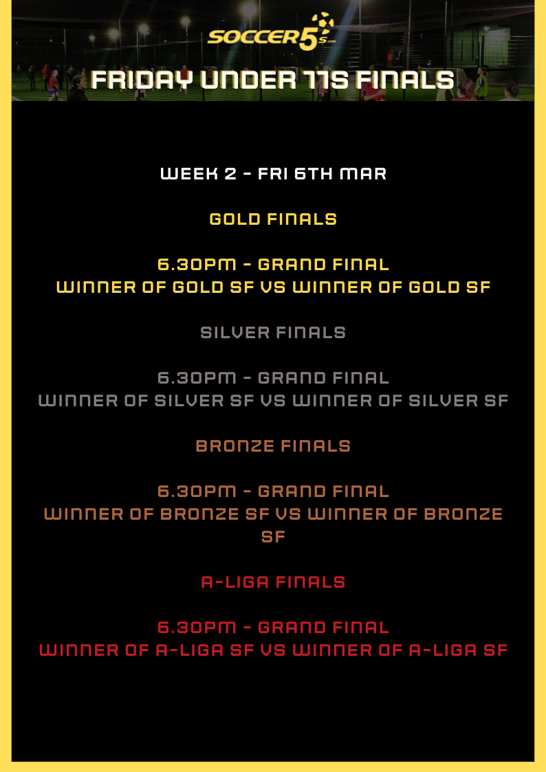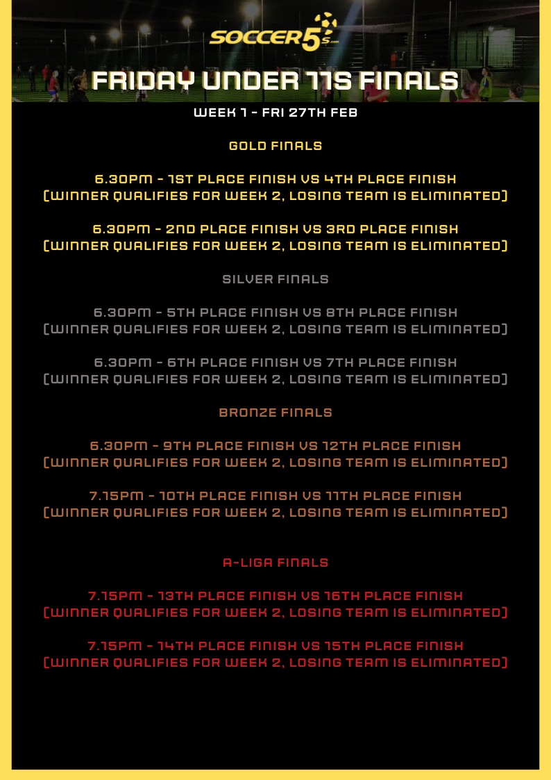 FINALS ARE HERE! Your position in finals will be decided on by your final position in the league. Finals begin Fri 27th Feb and below is an outline of how the finals for your competition will work. Please note the finals may change if any teams are unable to attend - if you are unable to attend the finals please text us on 0407614250 so we can adjust the draw to allow finals to run smoothly in advance.