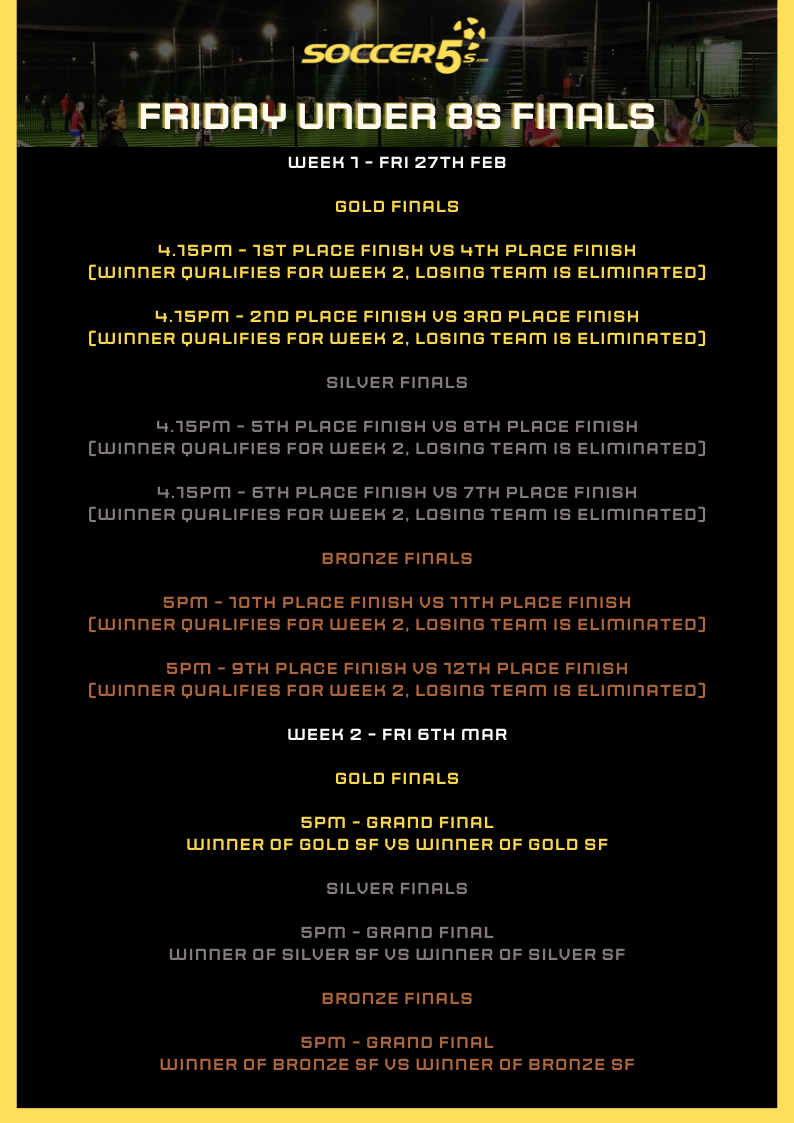 FINALS ARE HERE! Your position in finals will be decided on by your final position in the league. Finals begin Fri 27th Feb and below is an outline of how the finals for your competition will work. Please note the finals may change if any teams are unable to attend - if you are unable to attend the finals please text us on 0407614250 so we can adjust the draw to allow finals to run smoothly in advance.