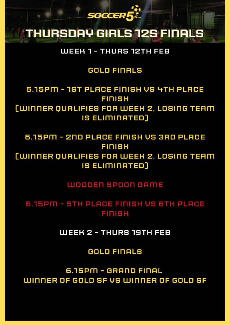 FINALS ARE HERE! Your position in finals will be decided on by your final position in the league. Finals begin Thurs 12th Feb and below is an outline of how the finals for your competition will work. Please note the finals may change if any teams are unable to attend - if you are unable to attend the finals please text us on 0407614250 so we can adjust the draw to allow finals to run smoothly in advance.