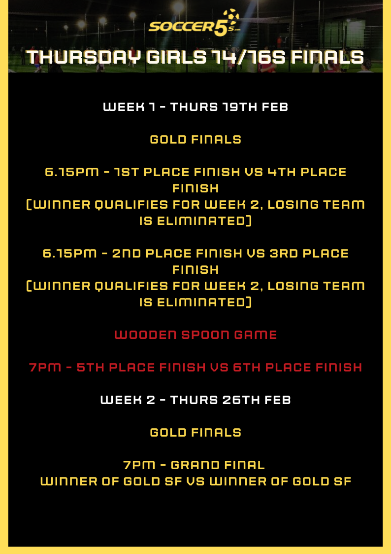 FINALS ARE HERE! Your position in finals will be decided on by your final position in the league. Finals begin Thurs 19th Feb and below is an outline of how the finals for your competition will work. Please note the finals may change if any teams are unable to attend - if you are unable to attend the finals please text us on 0407614250 so we can adjust the draw to allow finals to run smoothly in advance.