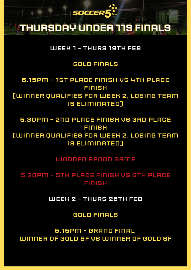 FINALS ARE HERE! Your position in finals will be decided on by your final position in the league. Finals begin Thurs 19th Feb and below is an outline of how the finals for your competition will work. Please note the finals may change if any teams are unable to attend - if you are unable to attend the finals please text us on 0407614250 so we can adjust the draw to allow finals to run smoothly in advance.