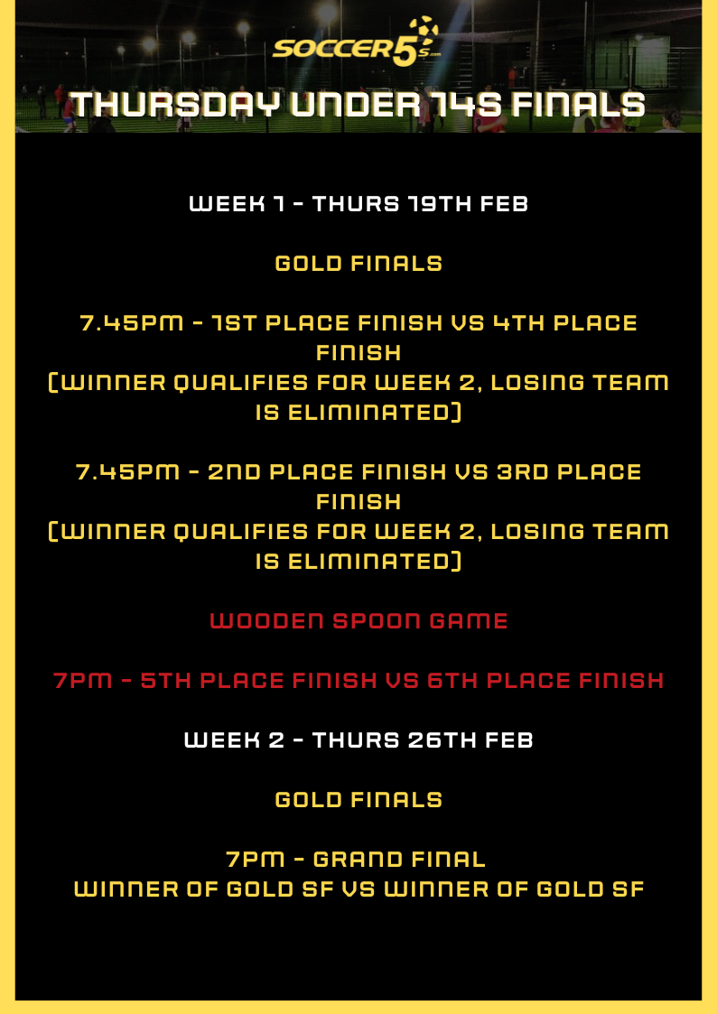 FINALS ARE HERE! Your position in finals will be decided on by your final position in the league. Finals begin Thurs 19th Feb and below is an outline of how the finals for your competition will work. Please note the finals may change if any teams are unable to attend - if you are unable to attend the finals please text us on 0407614250 so we can adjust the draw to allow finals to run smoothly in advance.
