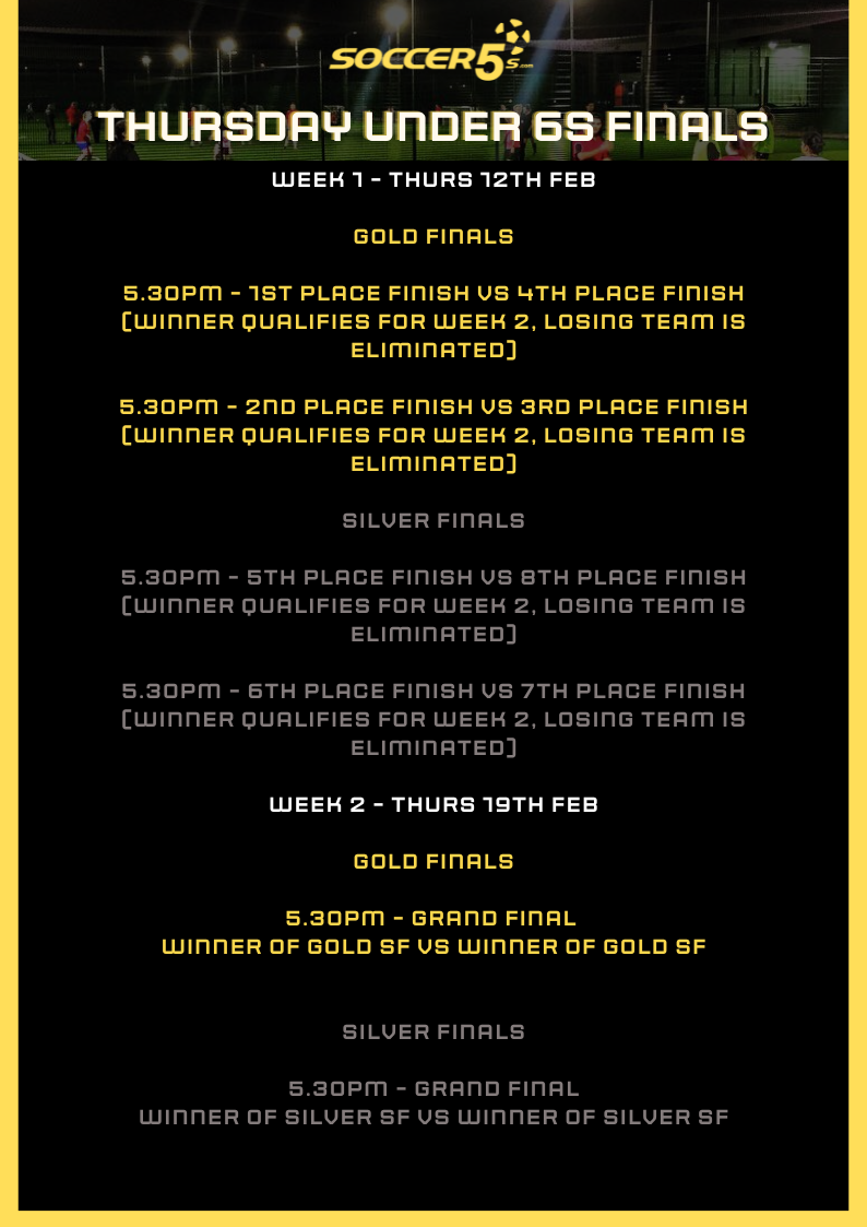 FINALS ARE HERE! Your position in finals will be decided on by your final position in the league. Finals begin Thurs 12th Feb and below is an outline of how the finals for your competition will work. Please note the finals may change if any teams are unable to attend - if you are unable to attend the finals please text us on 0407614250 so we can adjust the draw to allow finals to run smoothly in advance.