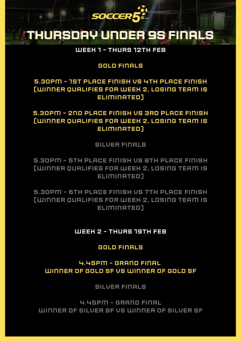 FINALS ARE HERE! Your position in finals will be decided on by your final position in the league. Finals begin Thurs 12th Feb and below is an outline of how the finals for your competition will work. Please note the finals may change if any teams are unable to attend - if you are unable to attend the finals please text us on 0407614250 so we can adjust the draw to allow finals to run smoothly in advance.