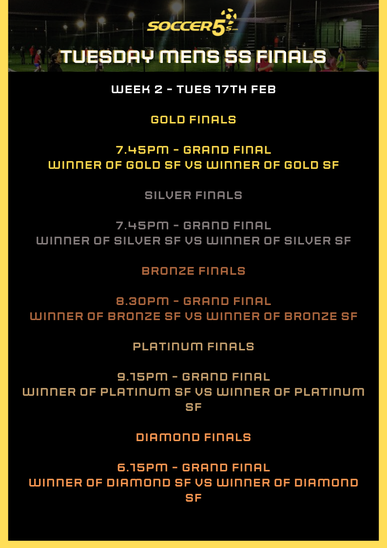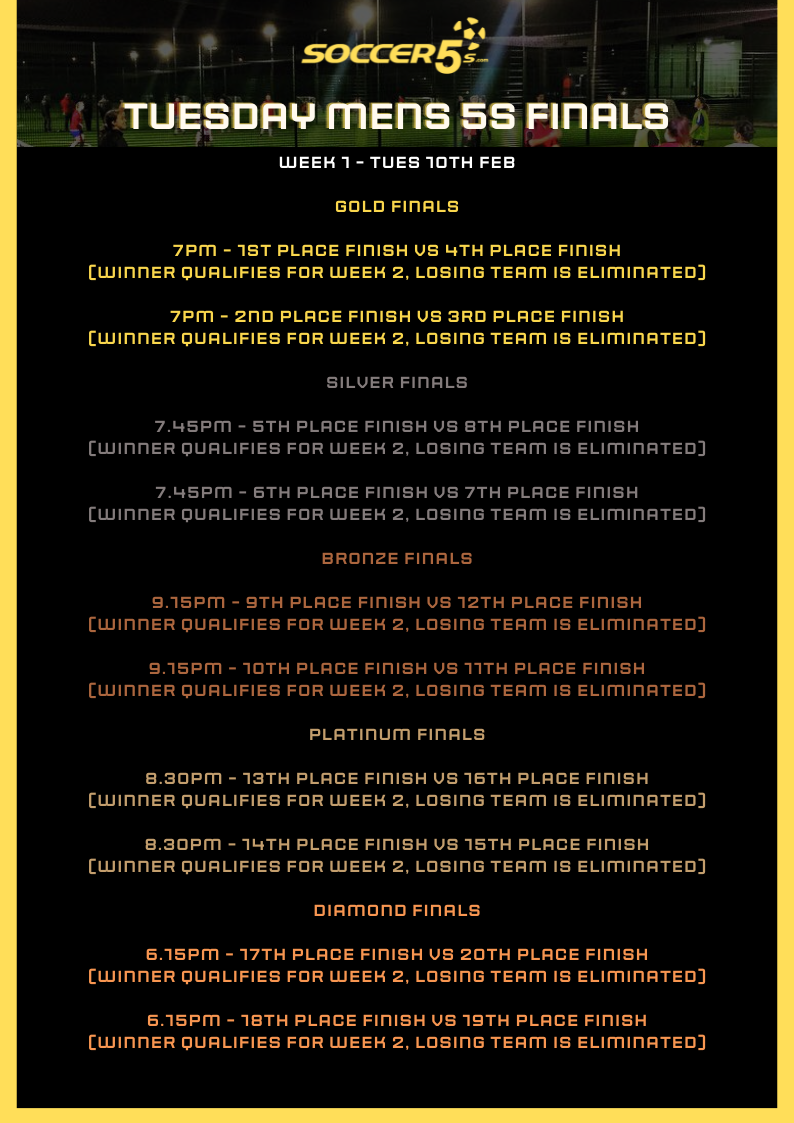 FINALS ARE HERE! Your position in finals will be decided on by your final position in the league. Finals begin Tues 10th Feb and below is an outline of how the finals for your competition will work. Please note the finals may change if any teams are unable to attend - if you are unable to attend the finals please text us on 0407614250 so we can adjust the draw to allow finals to run smoothly in advance.