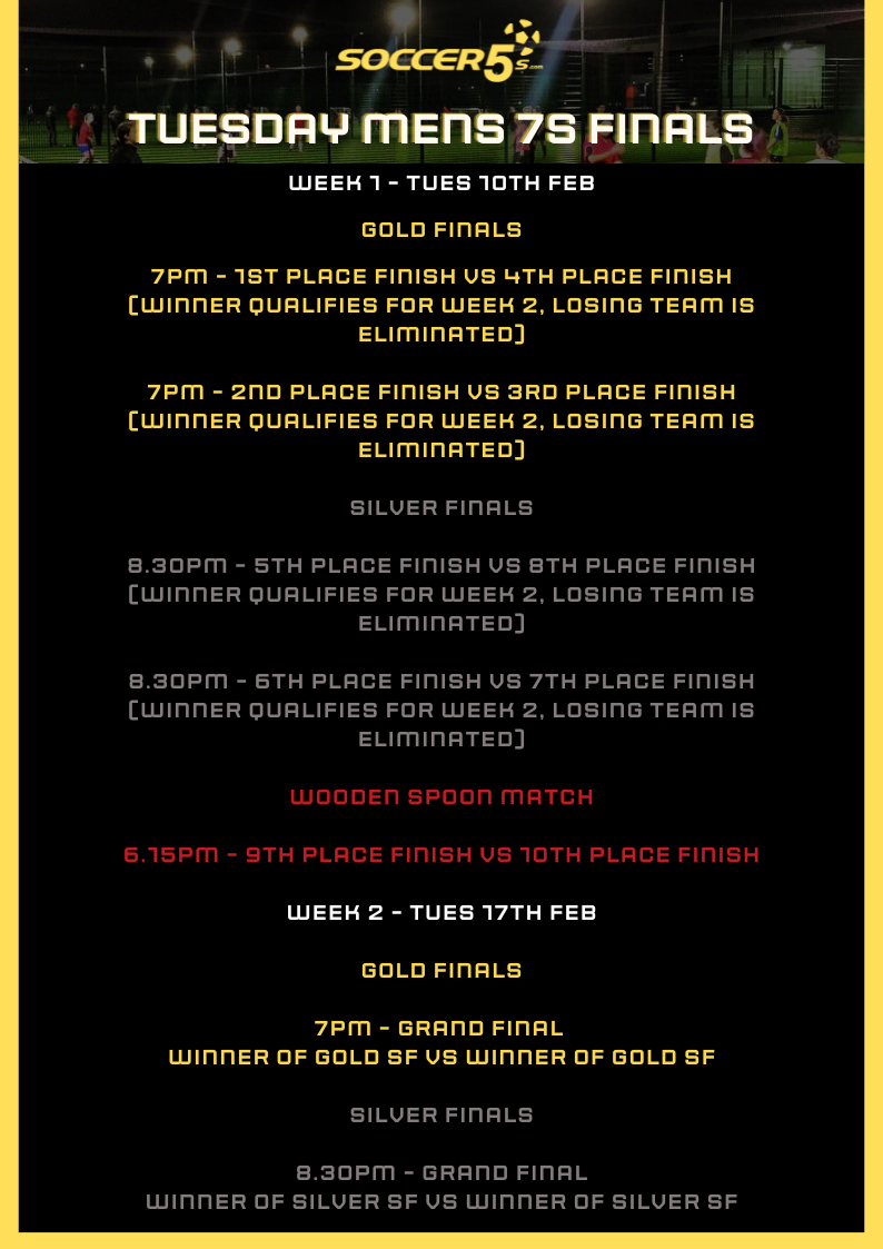 FINALS ARE HERE! Your position in finals will be decided on by your final position in the league. Finals begin Tues 10th Feb and below is an outline of how the finals for your competition will work. Please note the finals may change if any teams are unable to attend - if you are unable to attend the finals please text us on 0407614250 so we can adjust the draw to allow finals to run smoothly in advance.