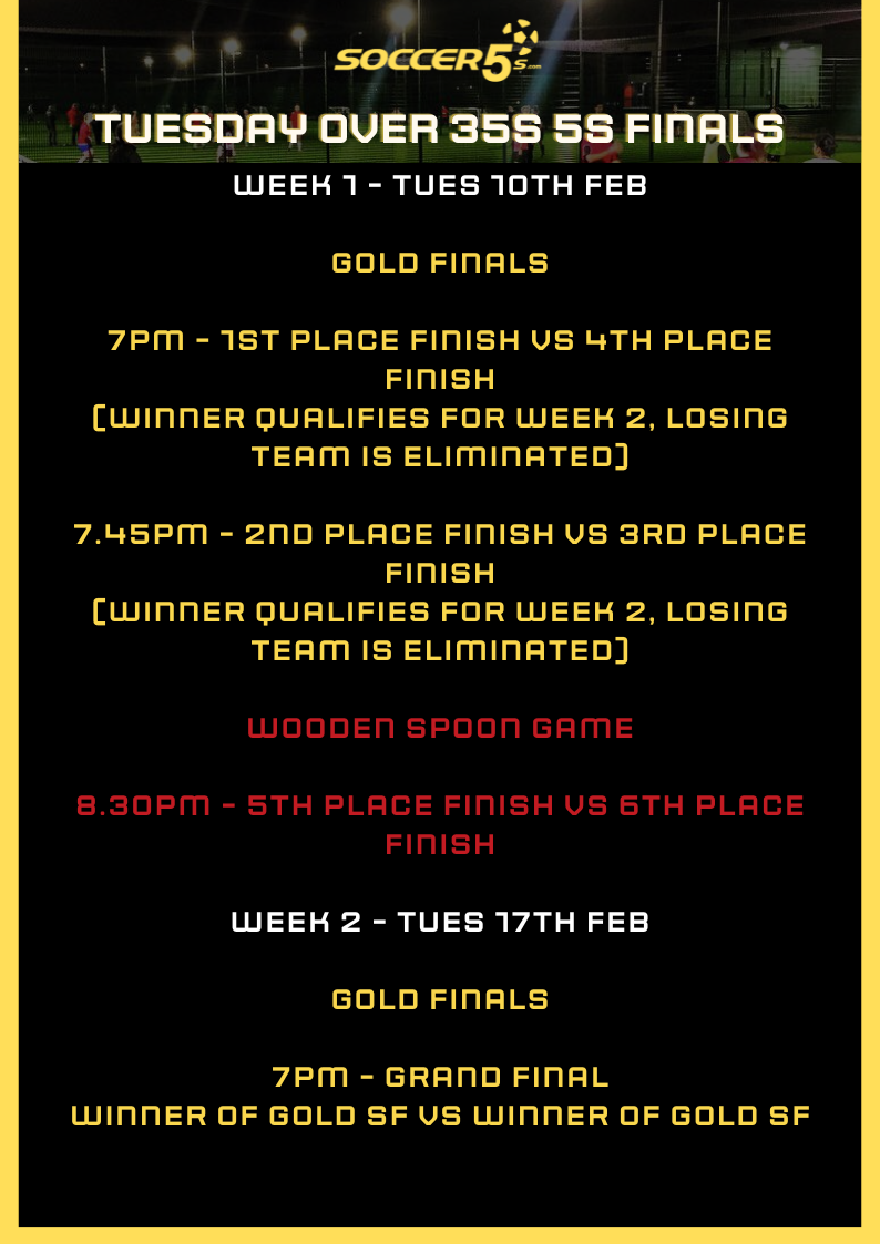 FINALS ARE HERE! Your position in finals will be decided on by your final position in the league. Finals begin Tues 10th Feb and below is an outline of how the finals for your competition will work. Please note the finals may change if any teams are unable to attend - if you are unable to attend the finals please text us on 0407614250 so we can adjust the draw to allow finals to run smoothly in advance.