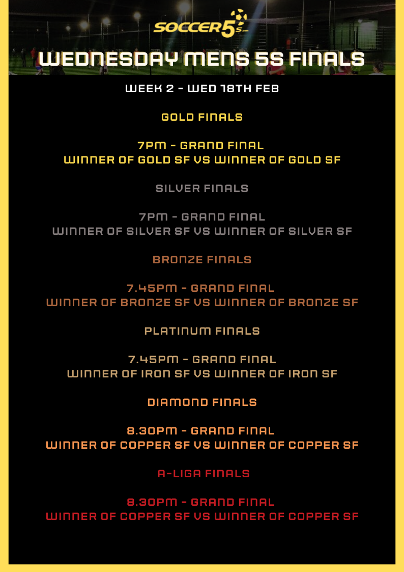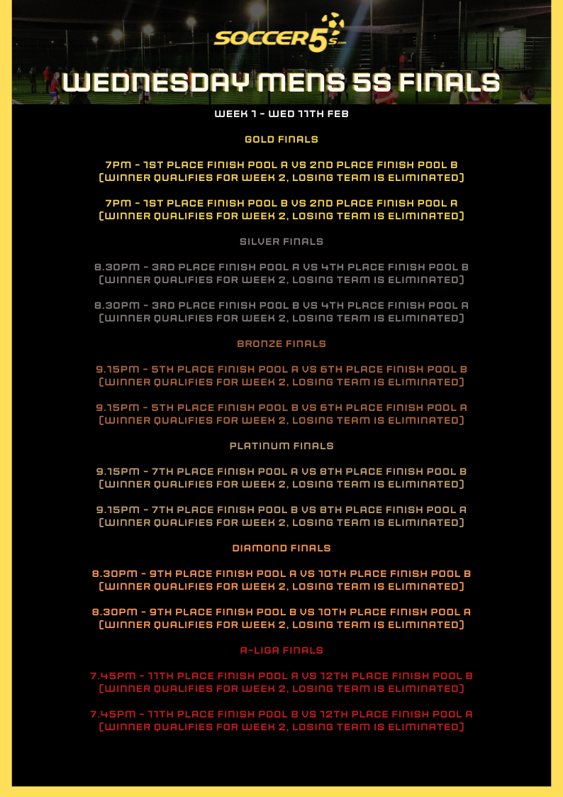 FINALS ARE HERE! Your position in finals will be decided on by your final position in the league. Finals begin Weds 11th Feb and below is an outline of how the finals for your competition will work. Please note the finals may change if any teams are unable to attend - if you are unable to attend the finals please text us on 0407614250 so we can adjust the draw to allow finals to run smoothly in advance.