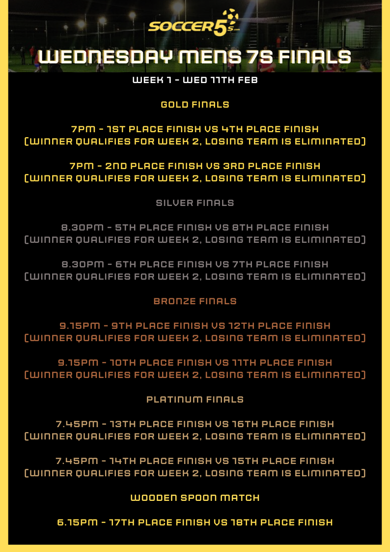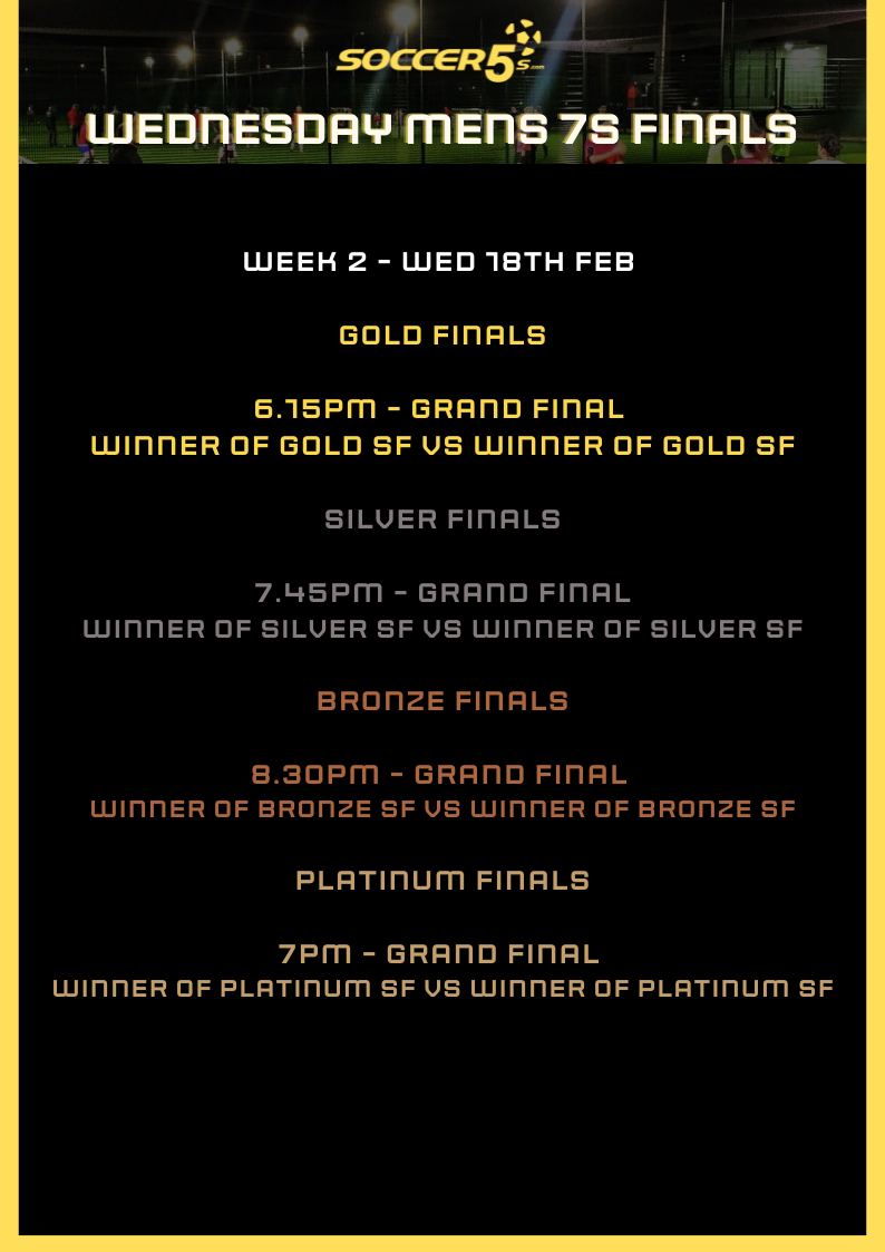 FINALS ARE HERE! Your position in finals will be decided on by your final position in the league. Finals begin Weds 11th Feb and below is an outline of how the finals for your competition will work. Please note the finals may change if any teams are unable to attend - if you are unable to attend the finals please text us on 0407614250 so we can adjust the draw to allow finals to run smoothly in advance.
