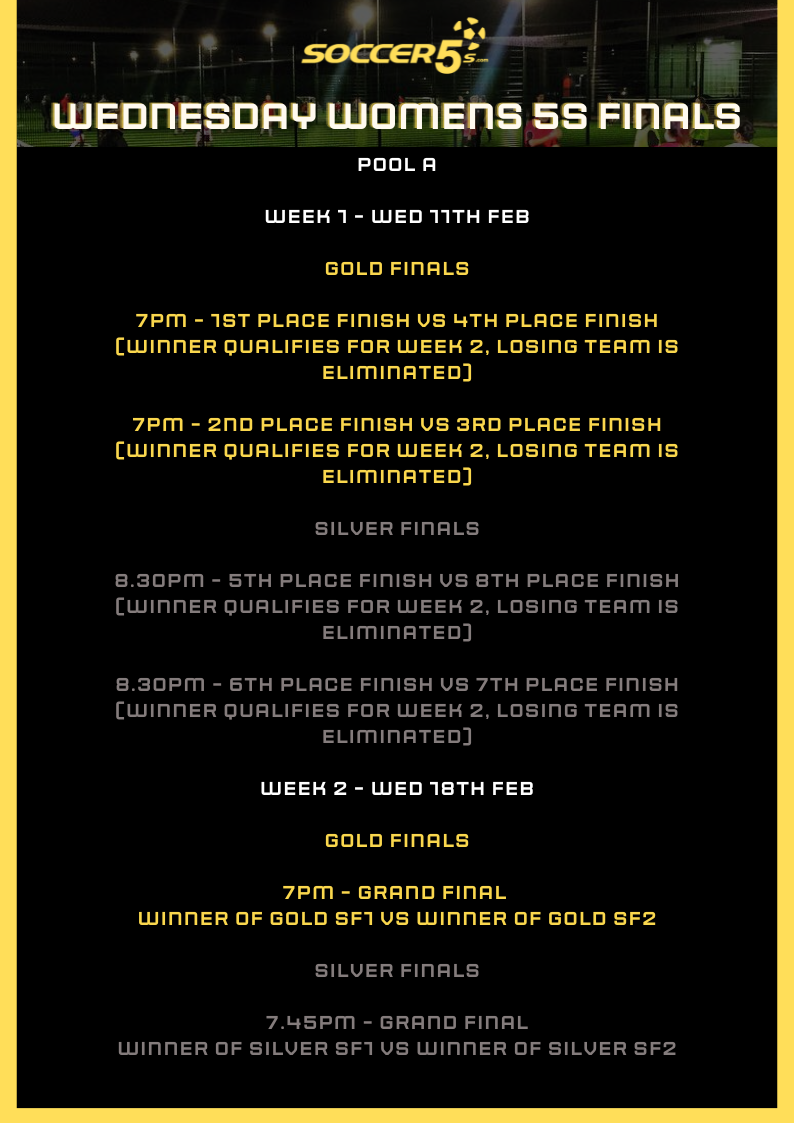 FINALS ARE HERE! Your position in finals will be decided on by your final position in the league. Finals begin Weds 11th Feb and below is an outline of how the finals for your competition will work. Please note the finals may change if any teams are unable to attend - if you are unable to attend the finals please text us on 0407614250 so we can adjust the draw to allow finals to run smoothly in advance.
